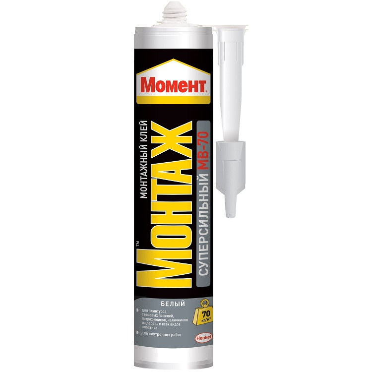 Момент Монтаж Суперсильный МВ-70 становится прозрачным после высыхания обладает высокой начальной силой склеивания (70 кг/м2) и отлично подходит для различных ремонтных работ.